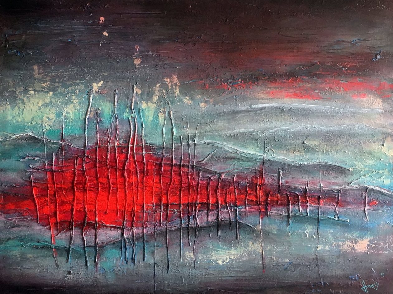 Acrylverf en raffia op linnen op aluminium frame. Abstract landschap, waarin de natuur het lijkt te winnen van de menselijke 'beschaving'.