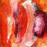 Acryl op paneel. Katoenen garen gespannen op frame dat tevens als lijst dient (niet op foto). Hierdoor is het garen op afstand van het schilderij gezet. De geometrische vormen zijn een ode aan Pythagoras, zijn filosofie en vegetarische levensstijl.