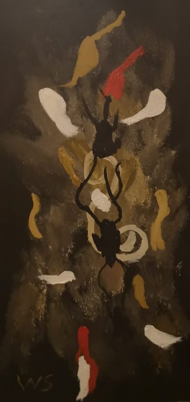 Dit abstract is geschilderd met olieverf op canvas doek vandijk bruin als achtergrond gele oker opgebouwd en rood en wit tinten erin en licht gele kleur om wat opvallende delen erin te verwerken. de eerste bruin en gele oker zijn ook nat in nat geschilderd daarna in lagen opgebouwd laten drogen.